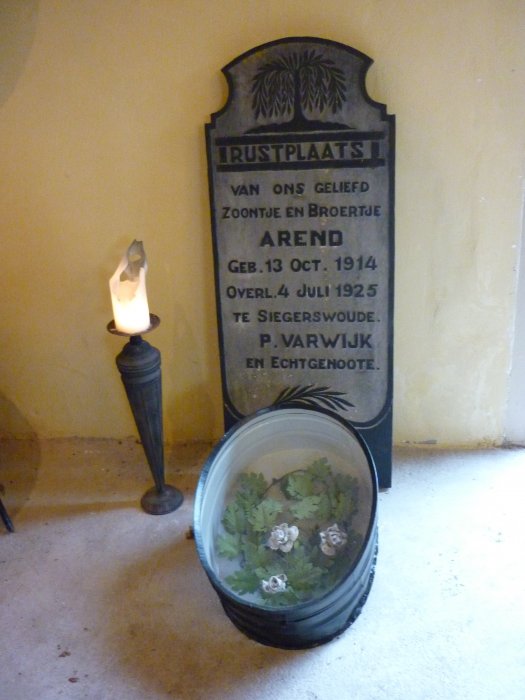 Het betrof het graf van Arend Varwijk, hij was geboren op 13 oktober 1914 in Siegerswoude en op 10 jarige leeftijd overleden aan hersenvliesontsteking. Op de foto staat Arend achter zijn moeder, naast zijn vader.