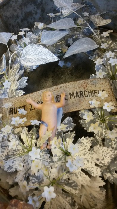 Op haar grafje stond een klein trommeltje, waarin een kransje met verschillende blaadjes en vergeet mij nietjes van zink, een porseleinen engeltje met blauw lendendoekje en een tekstlint van blik.