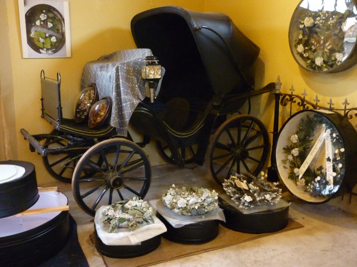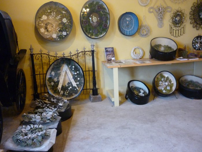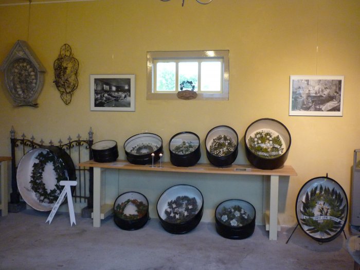 Er wordt een aantal vroege graftrommels getoond en er zijn trommels te zien, die afkomstig zijn van kindergraven. Het museum heeft ook de beschikking gekregen over een paar trommels, die werden gegeven aan een vooraanstaand lid van een dorpsgemeenschap. Bijzonder is de trommel voor een Franse soldaat, gesneuveld tijdens de Eerste Wereldoorlog. Naast een foto en een kralenkrans is ook een deel van zijn soldatenjas in de trommel opgenomen. Verder zijn er verschillende Duitse en Franse kralenkransen te zien en afbeeldingen van werkplaatsen, waar de kransen vroeger werden gemaakt.