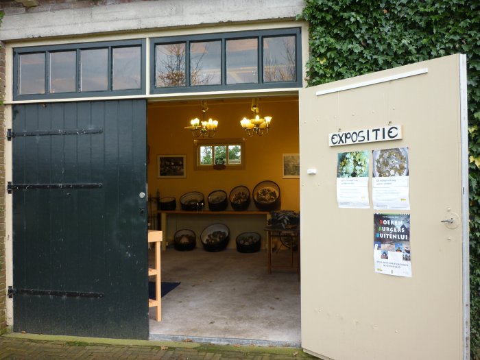De voorzitter van de Nederlandse Stichting tot behoud van Graftrommel, Evert Jan Halkus, zijn vrouw Lidy en de Stichting Historisch Goor zijn de grondleggers van de expositie in deze aula. Er zijn zowel graftrommels met metalen kransen als kransen met glaskralen te bezichtigen.