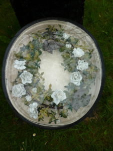 Twee trommels met kralen kransen. Op de achtergrond één van de trommels uit Deinze.