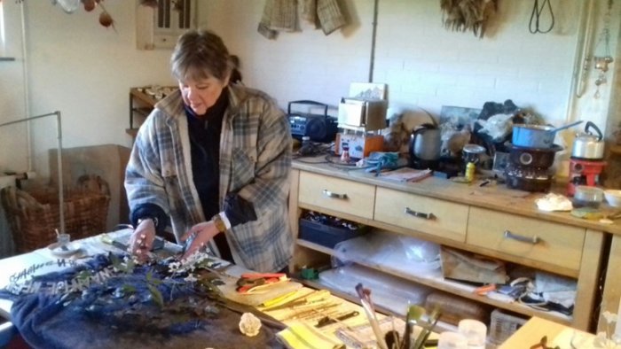 Pieke van Doorn-Witteveen bezig met een krans in het winteratelier.