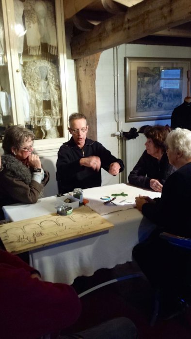 Evert Jan Halkus geeft demonstratie van restauratie kralen kransen.
