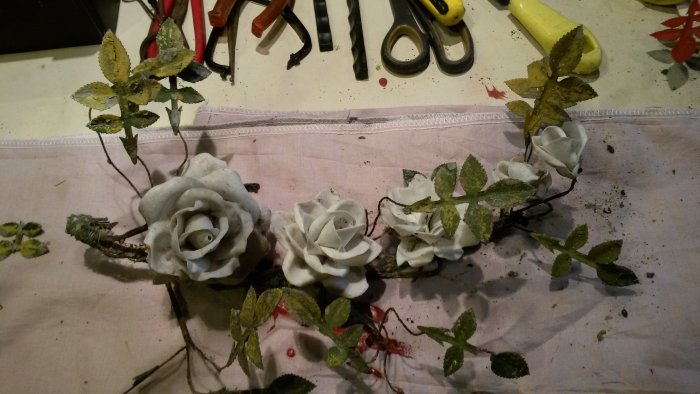 Met de kransen is het vaak niet beter gesteld. De metalen bladeren en bloemen werden met ijzerdraad op een metalen ring bevestigd. Dit ijzerdraad werd niet verzinkt of gegalvaniseerd, maar meestal omwikkeld met papier of stof om de bladstengels en bloemstelen zo goed mogelijk na te bootsen.