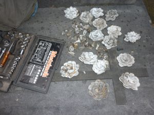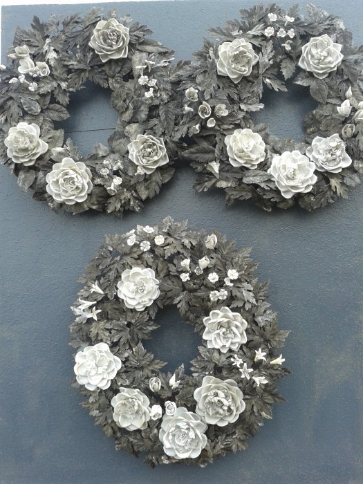 De drie kransen hebben in totaal 576 verschillende blaadjes, waarvan bijna alles van de moederring geroest was. Verder bevatten de kransen ook nog bloemen van porselein: 15 grote rozen en 70 knopjes. Besloten werd alle 576 blaadjes te voorzien van nieuwe stelen voordat ze weer aan de moederring gesoldeerd zouden worden. Door het miniem aantal blaadjes dat nog wel aan de moederring vast zat, was een “mogelijk patroon” in de kransen te ontdekken. De blaadjes zijn van zink, zwart geverfd met een laagje glas grit, dus echte rouwkransen.