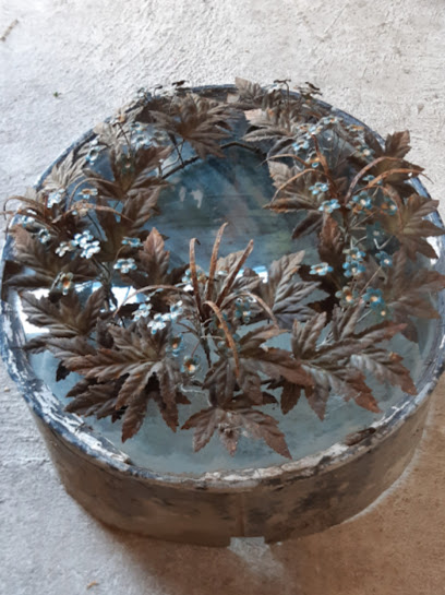 In de trommel van Marietje ligt een krans van eikenbladeren, wit, met daarbij nog een engeltje van steengoed en een ‘lint’ gezaagd uit zink en beschilderd.