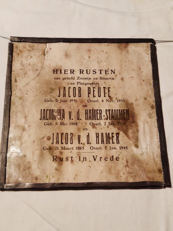 Bijzonder is dat ook pleegouders zijn opgenomen in de tekst welke in het trommeltje zat, Jacomina v.d. Hamer-Stammen en Jacob v.d. Hamer.