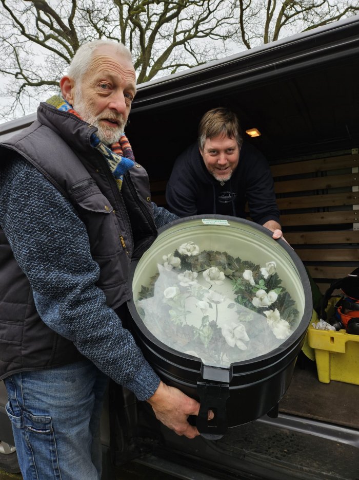 De gerestaureerde kransen worden in de kast teruggeplaatst op het graf van Vincent Verbunt in Tilburg.